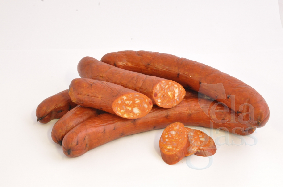 vepř. hov maso,voda, směs koření, bramborový škrob, dus.sol.směs(jedlá sůl) max.2,8, konzervant E250, sojový protein, stabilizátory E450,E420, antioxidant E300, extrakty koření, paprika ostrá OL tekutá, min obsah masa 60%,max.obsah tuku 30%